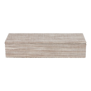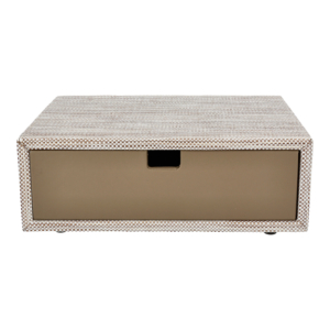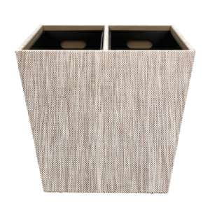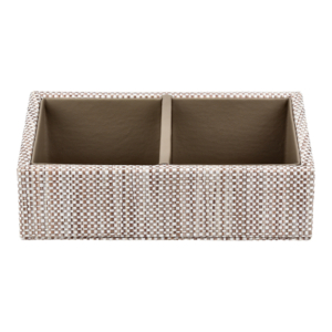 Elegancia y funcionalidad para los accesorios de habitaciones de hotel de la colección Tribe, con un interior en cuero sintético oliva y un acabado exterior tejido en gris-beige.