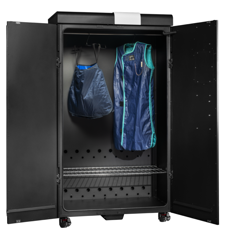 Armario Novven 3 Pack Óptimo para desinfección, secado y desodorización de EPI y equipos. Gracias a su tecnología patentada Smart Air Care, se convierte en un verdadero aliado para optimizar sus protocolos de higiene, ya sea para EPI de radioprotección, calzado, gorros u otros equipos sensibles.
