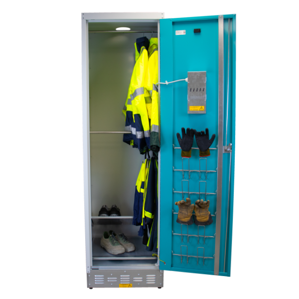 El armario SANIbox 600 de acero garantiza un secado y desodorización rápidos de los EPI y prendas. Robusto y fácil de limpiar, es ideal para entornos exigentes: gestión de residuos, tratamiento de aguas, deportes y ocio.