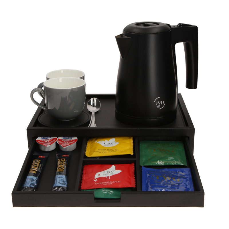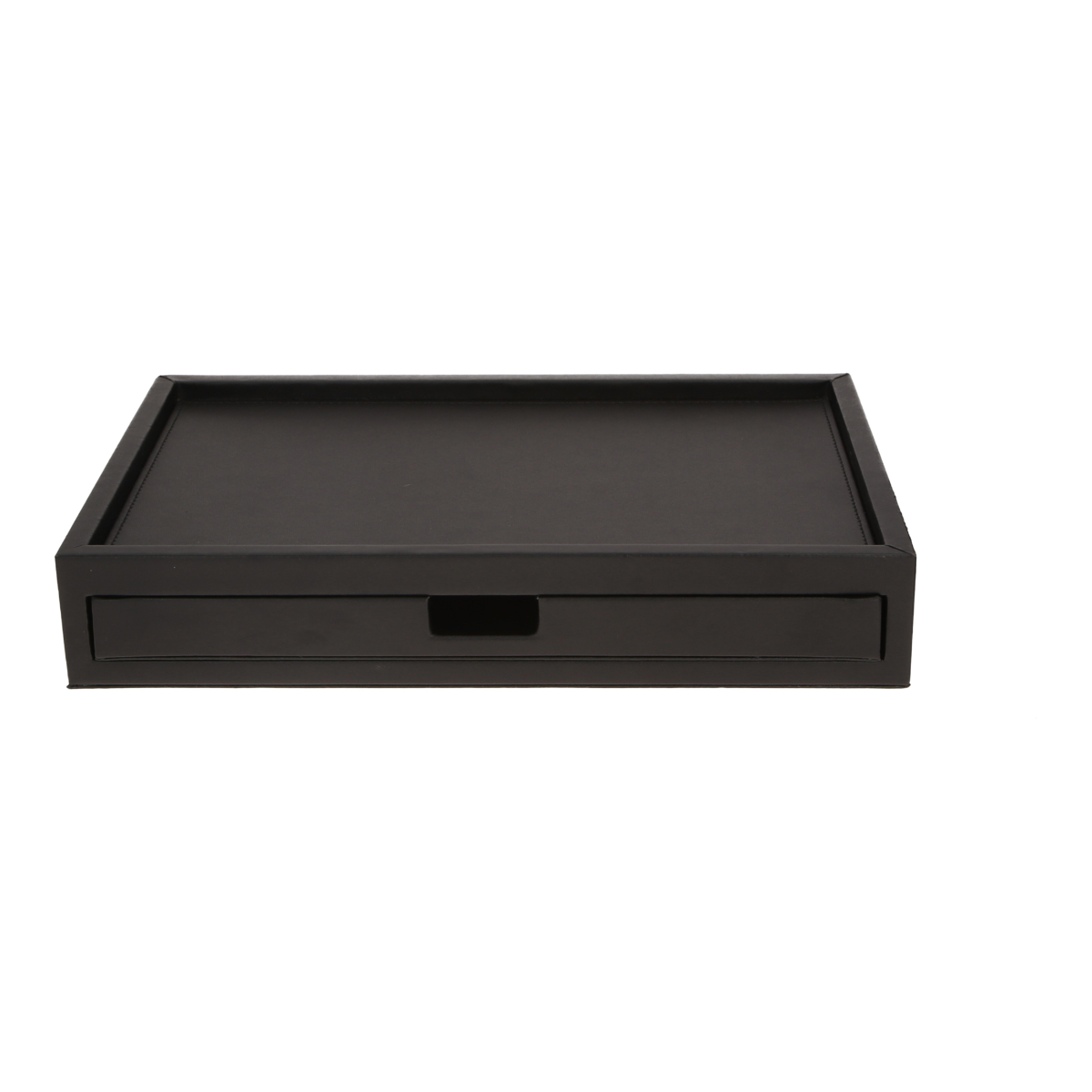 Bandeja de cortesía con cajón integrado en acabado de cuero negro.