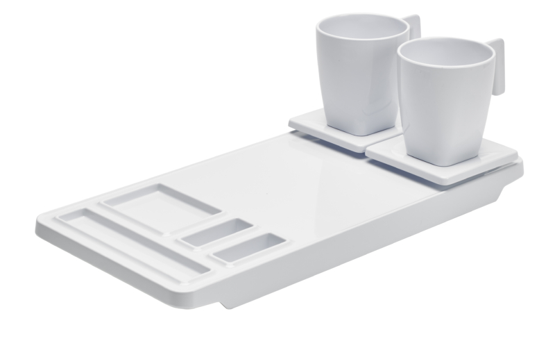 Bandeja Maestro blanca perforada con ranuras integradas para sobres, resistente a las quemaduras y con acabado anti-manchas. Posibilidad de fijar el soporte de los hervidores Diva y Duchesse.