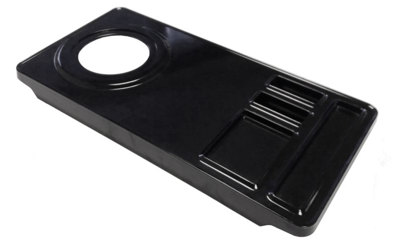 Bandeja Maestro negra perforada con ranuras integradas para sobres, resistente a las quemaduras y con acabado anti-manchas. Posibilidad de fijar el soporte de los hervidores ZENITH y Duchesse.