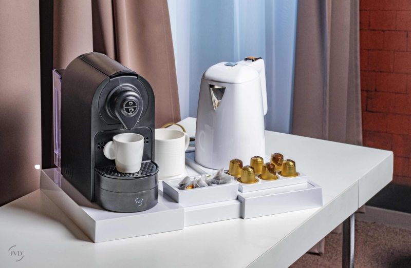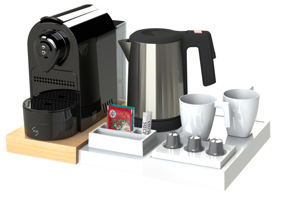 Bandeja de bienvenida Orchestro perforada, modulable en melamina blanca, que permite albergar una cafetera y un hervidor.