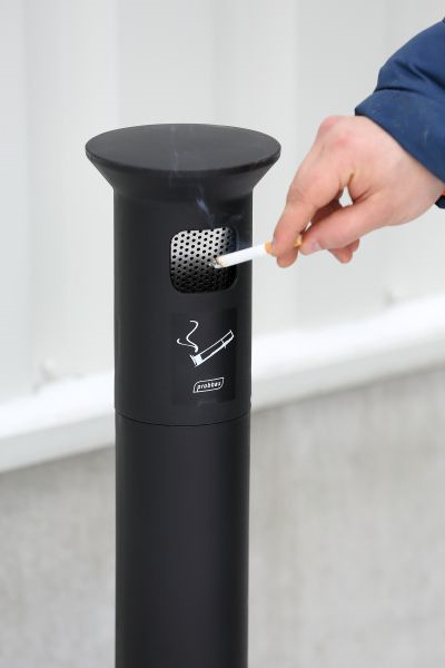 Cenicero de pie 10L en plástico, diseñado para resistir la intemperie y los golpes. Se suministra con un cubo interior galvanizado extraíble de 10 litros (acceso bloqueable – cerradura no incluida) para un vaciado rápido.