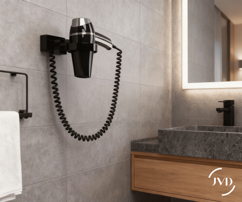 Kit Secador de pelo Clipper negro, 1400 W + soporte universal, precableado para una instalación rápida, orientable a 180°. Hecho en Francia.