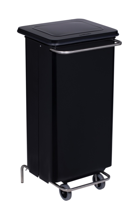 Contenedor móvil de 110L negro en acero. Apertura frontal para facilitar la evacuación de la bolsa de residuos.