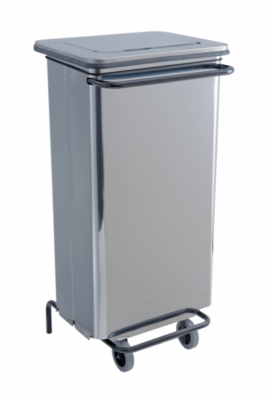 Contenedor móvil de 110L en acero inoxidable brillante con pedal y asa en acero con recubrimiento epoxi. Apertura frontal para facilitar la evacuación de la bolsa de residuos.