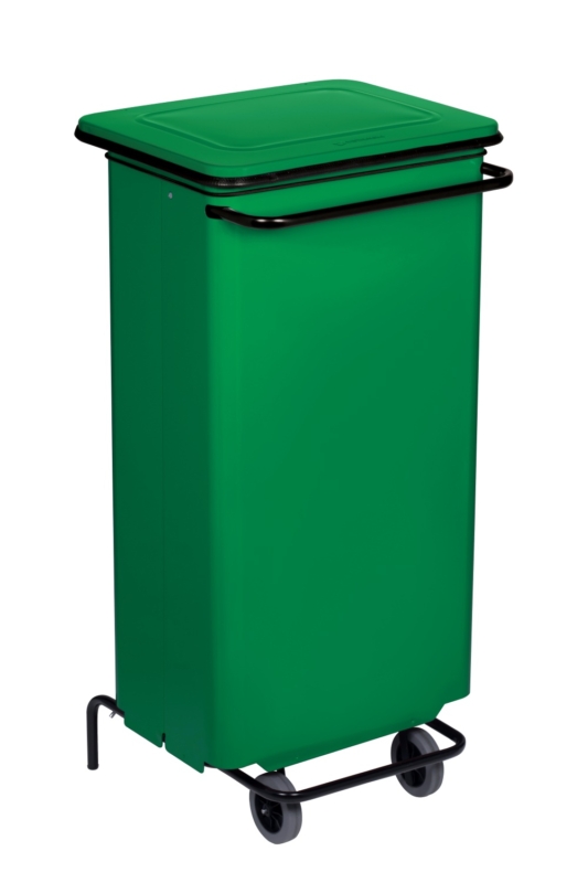 Contenedor móvil de 110L verde en acero, ideal para la recogida selectiva. Apertura frontal para facilitar la evacuación de la bolsa de residuos.