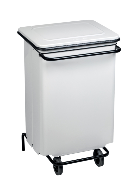 Contenedor móvil de 70L blanco en acero. Apertura frontal para facilitar la evacuación de la bolsa de residuos.