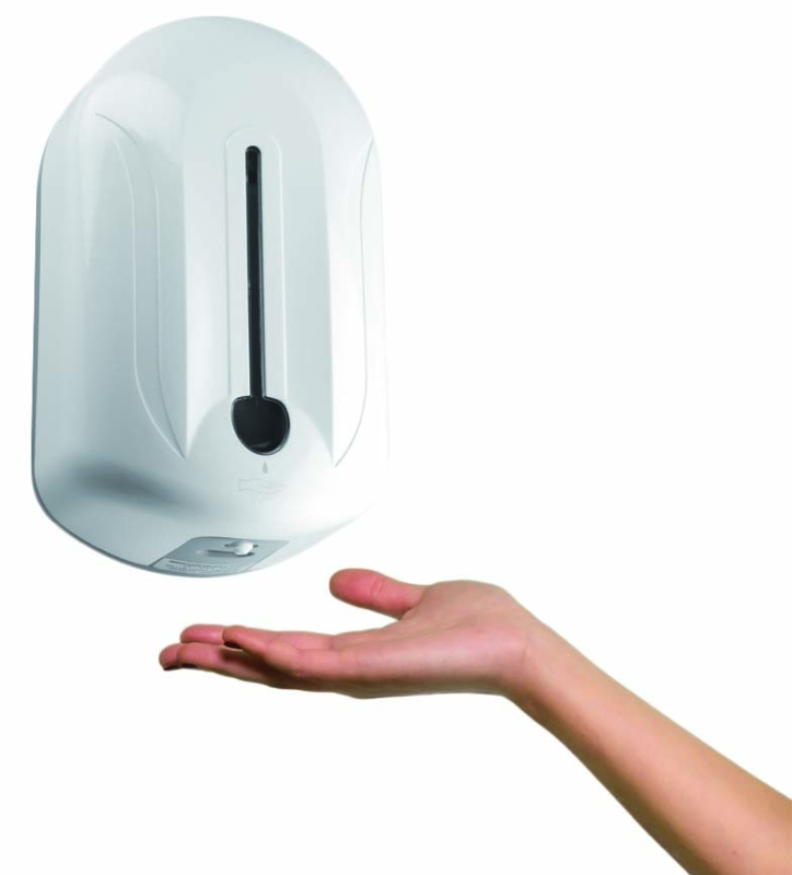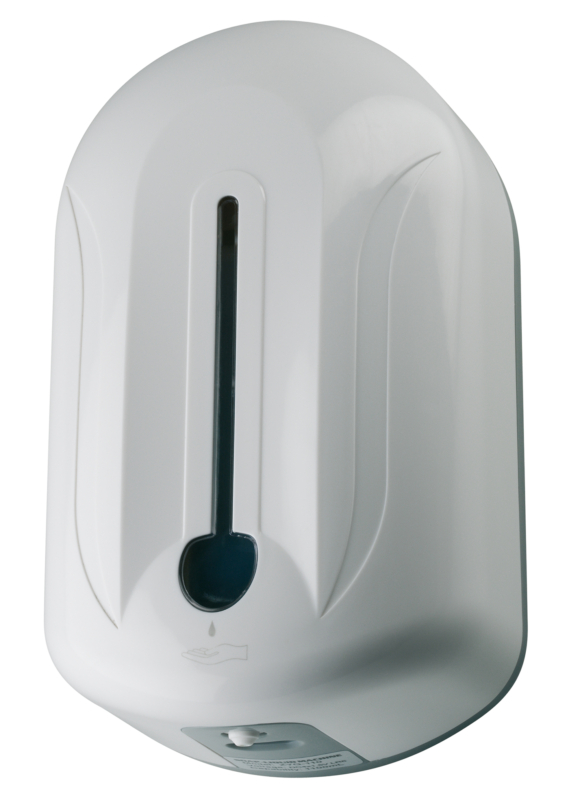 Dispensador de jabón Saphir 1100 ml con detección automática de manos y visor de nivel translúcido. Dosificación de 1 ml por dosis. Compatible con gel hidroalcohólico. Funciona con 4 pilas de 1,5 V tipo LR6 (AA), no incluidas.