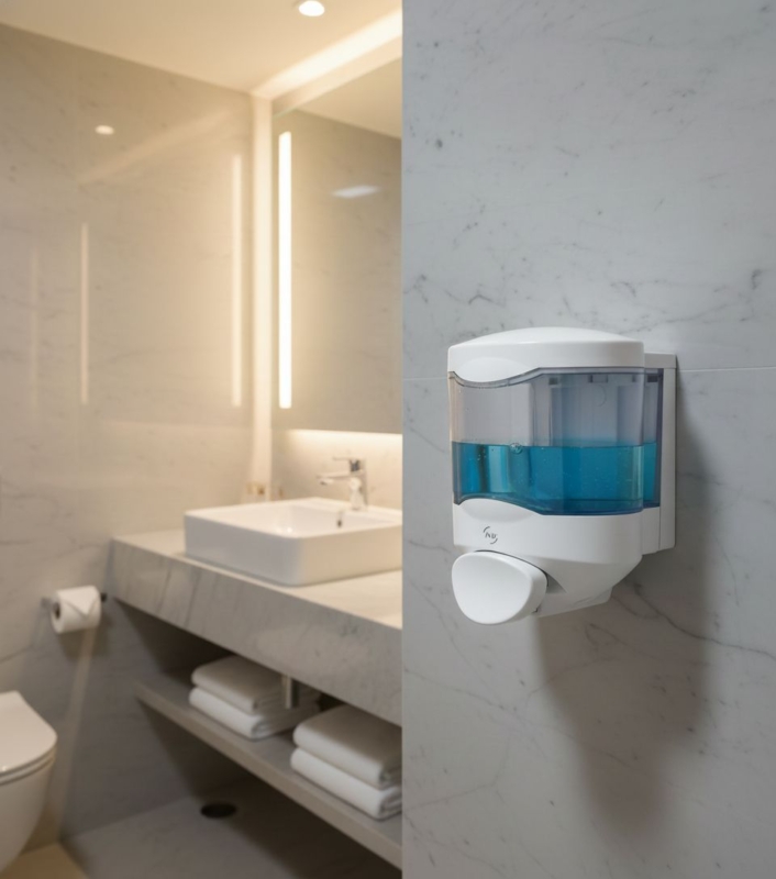 Dosificador de jabón Crystal 450 ml. Equipado con una bomba de silicona de larga duración. Dispensa 1 ml de jabón por pulsación. Compatible con gel hidroalcohólico.