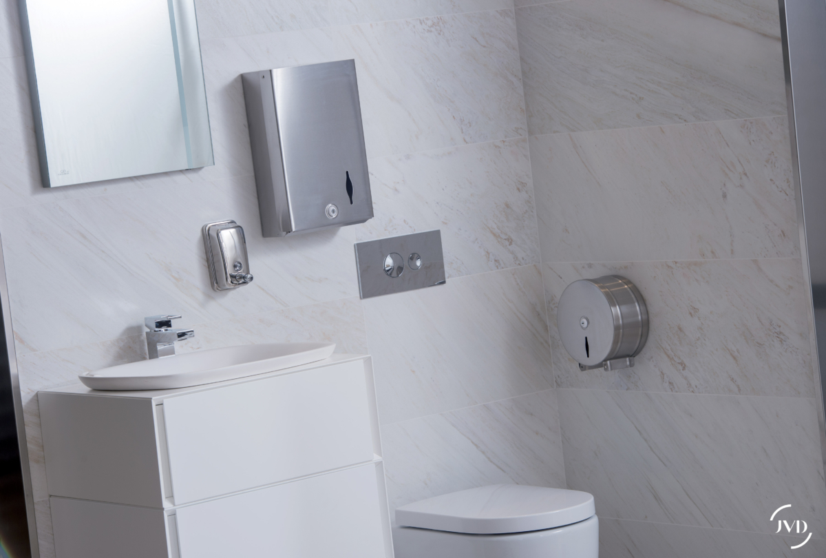 Dispensador de papel higiénico JUMBO para rollo de 400 m, metal blanco. Eje metálico y ventana para visualizar el nivel de papel.