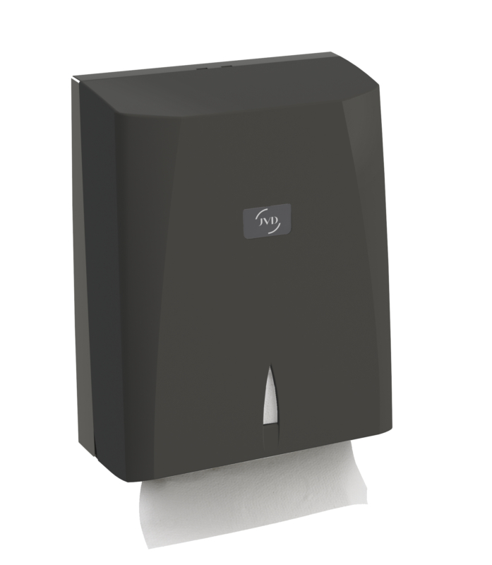 Dispensador Yaliss de toallas de papel negro mate. Capacidad para 400 a 700 hojas (formato máximo 255 mm). Fabricado con un 50% de plástico reciclado.