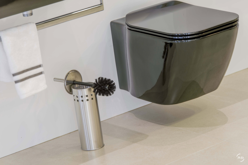 Escobilla para WC con su soporte en acero inoxidable satinado. Base de plástico antideslizante que protege el suelo. De pie.
