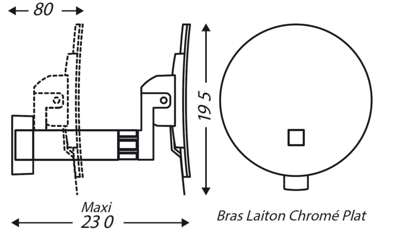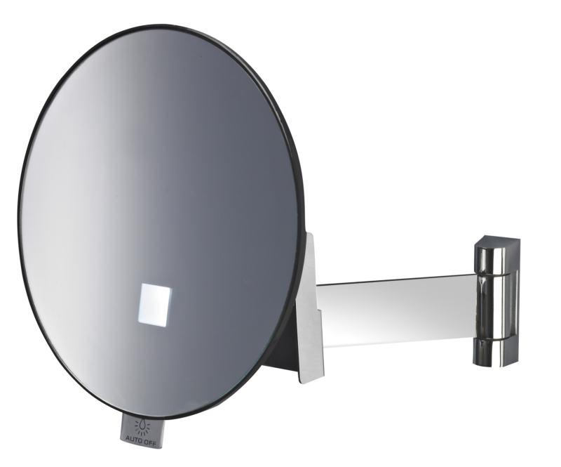 Espejo ECLIPS redondo iluminado con brazo plano y aumento ×3. Funciona con 1 pila de litio de 3,6 V incluida, lo que permite una instalación sin conexión eléctrica. El espejo cuenta con temporizador de 3 min. Brazo plano de latón cromado con 3 articulaciones. Encendido mediante sistema táctil.