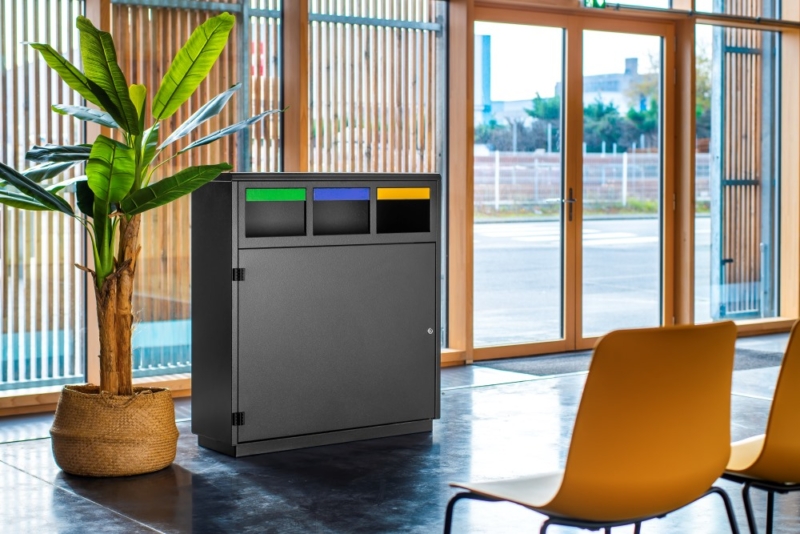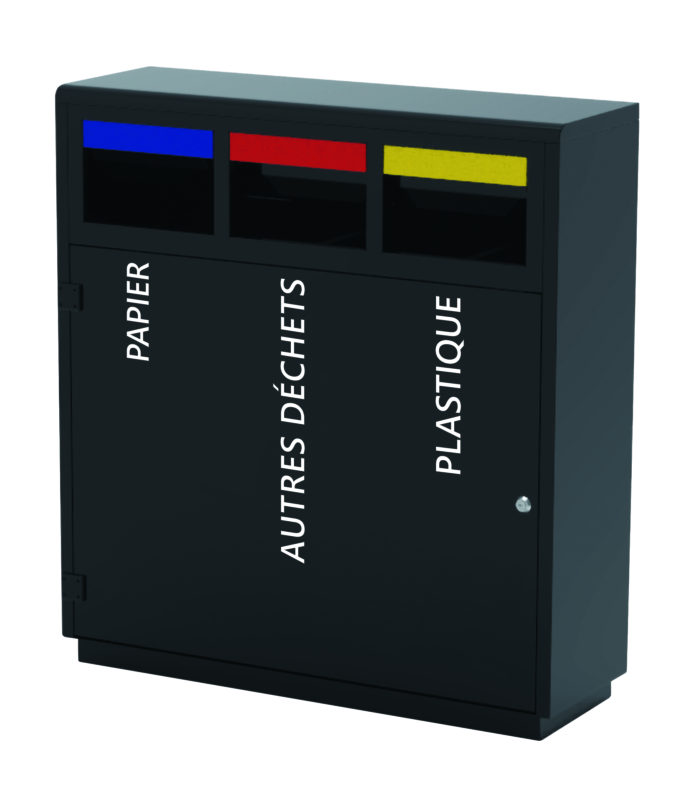 Estación de clasificación negra de 3 compartimentos de 40L en acero epoxi. Porta-bolsas integrado y amplia apertura frontal para facilitar la extracción de la bolsa.
