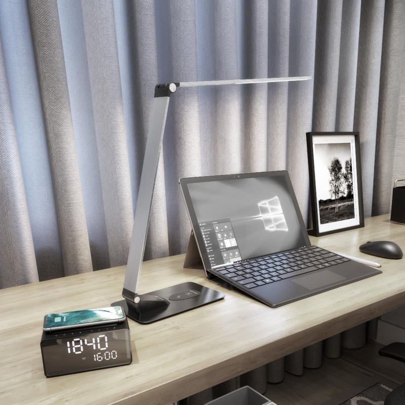 Despertador estéreo Wave, carga inalámbrica y USB, entrada AUX, Bluetooth, radio FM, atenuación de la luz. Diseñado para hostelería: alarma única, repetición, funcionamiento con batería en caso de corte de alimentación. Cable antirrobo opcional.