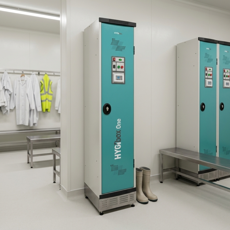 Taquilla secadora compacta, 300 mm de ancho, diseñada para integrarse en las industrias más exigentes (alimentaria, farmacéutica, energía). Asegura almacenamiento, secado, desodorización y saneamiento de uniformes y equipos.
