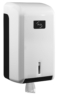 Dispensador central Mini Cleanline blanco. Capacidad para bobina de 200 servicios (diámetro 130 mm). Fabricado al 100 % en plástico reciclado.