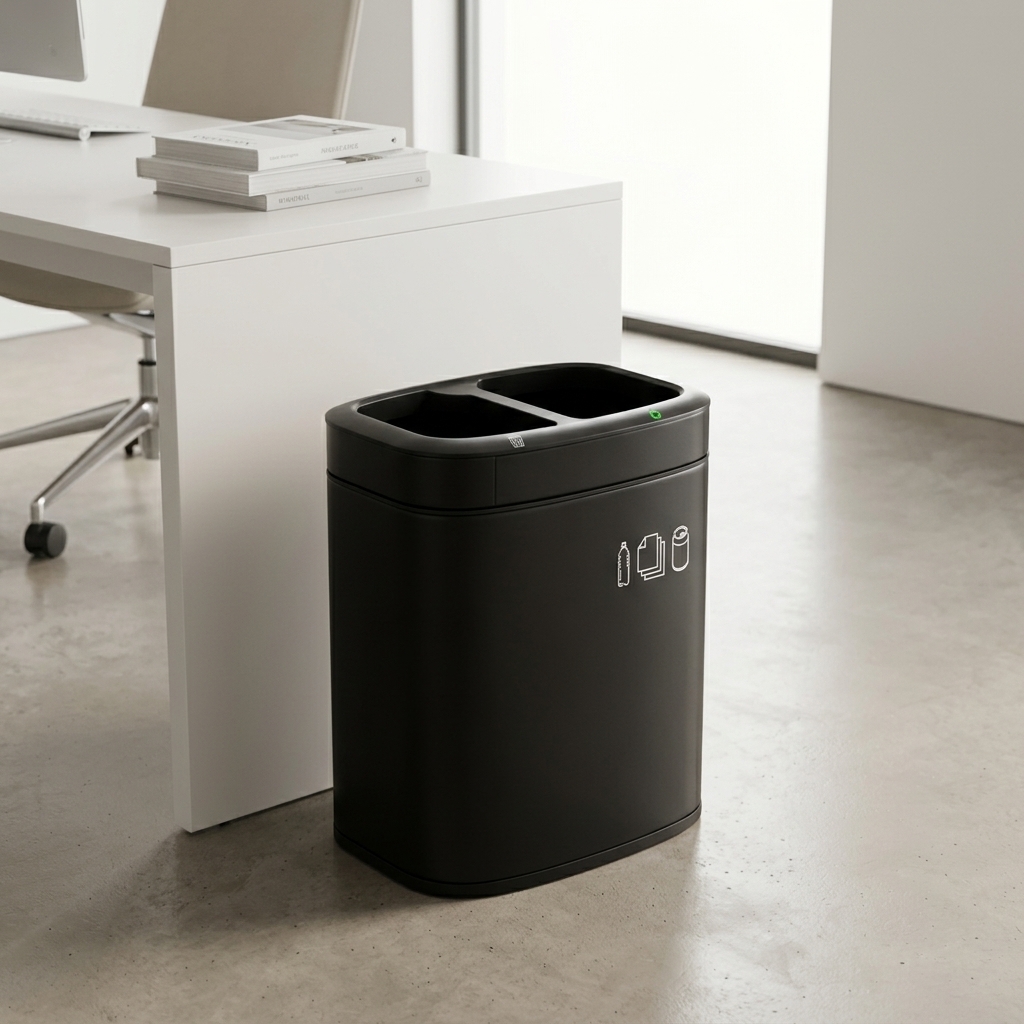 Papelera de reciclaje ovalada con 2 compartimentos y tapa que permite ocultar la bolsa de basura