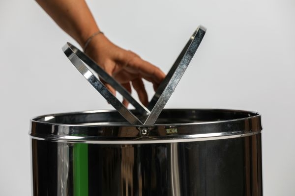 Papelera Push 40L en acero inoxidable pulido espejo, equipada con tapa basculante en acero inoxidable silenciosa montada sobre resorte y con soporte para bolsa que mantiene los residuos fuera de la vista. Un anillo de caucho alrededor del borde inferior protege el suelo de los arañazos y la papelera de los productos químicos.