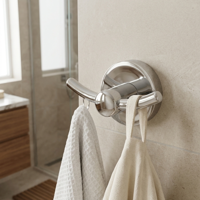 Percha doble en acero inoxidable 304, acabado cromado, fácil de instalar.