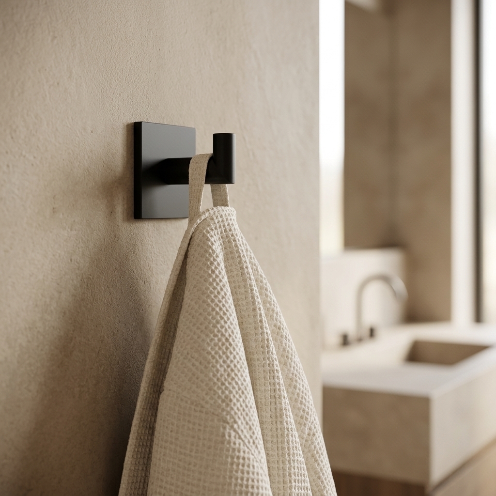 Percha simple de acero con acabado negro mate, fácil de fijar al muro