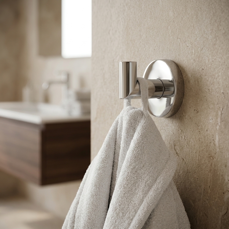 Percha simple en acero inoxidable 304, acabado cromado, fácil de instalar.
