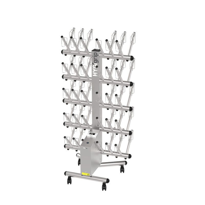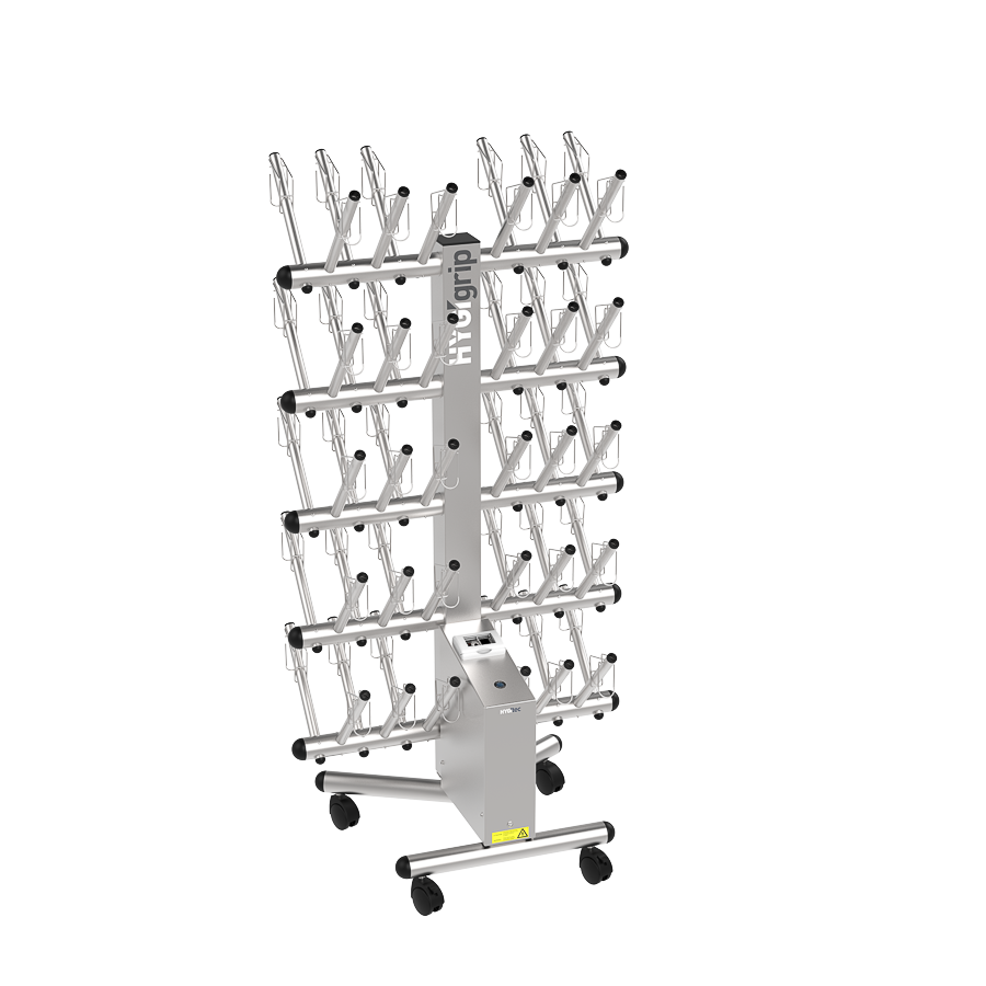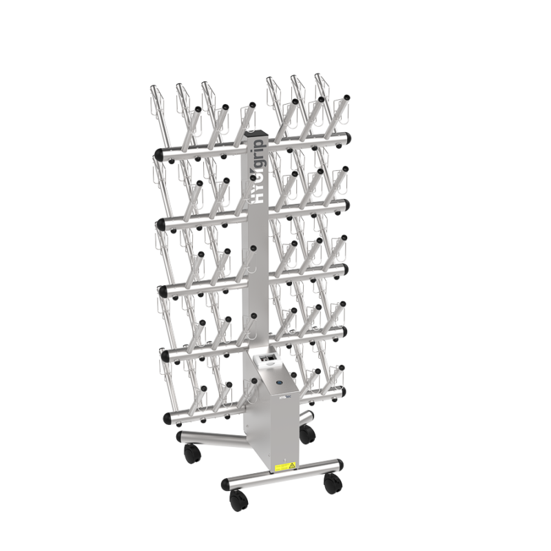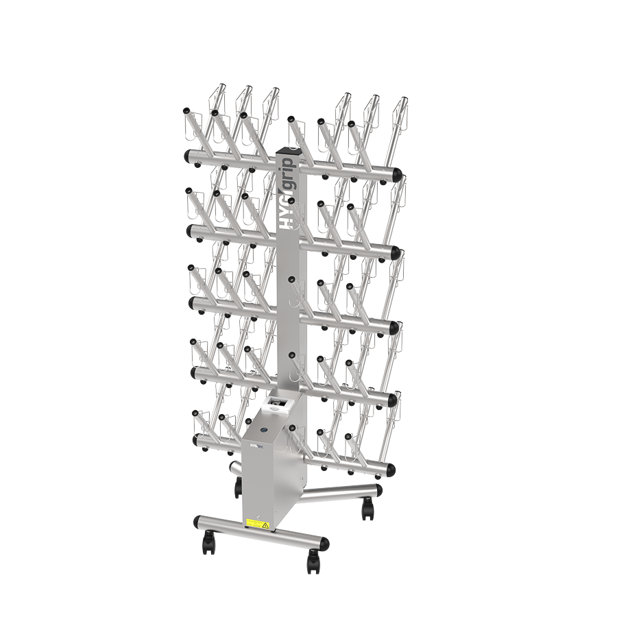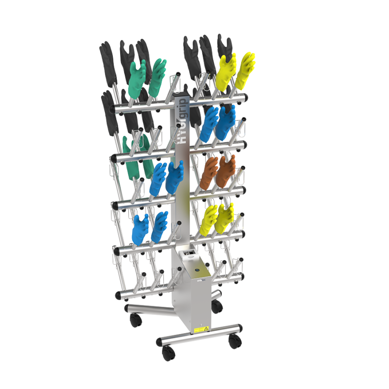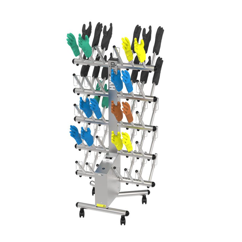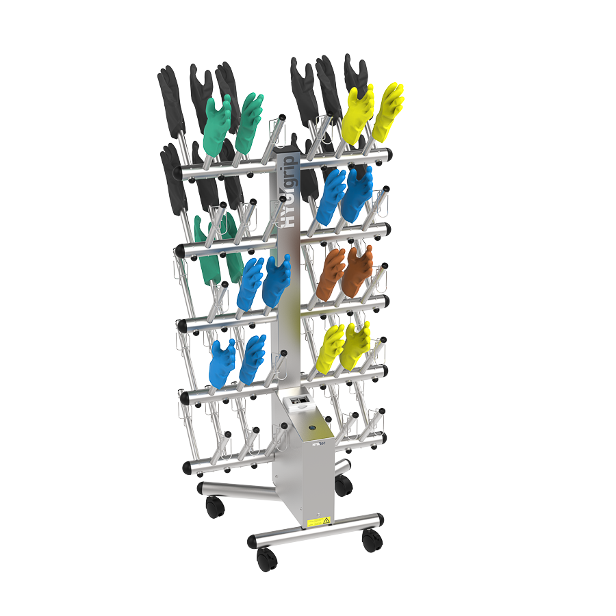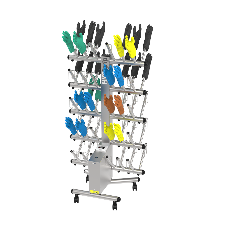 Secador de guantes HYGIgrip – 30 pares, doble cara, 100 % acero inoxidable 304L. Desinfecta sin químicos todo tipo de guantes. Equipado con manguitos específicos y 4 ruedas giratorias. Compacto, robusto y eficaz.