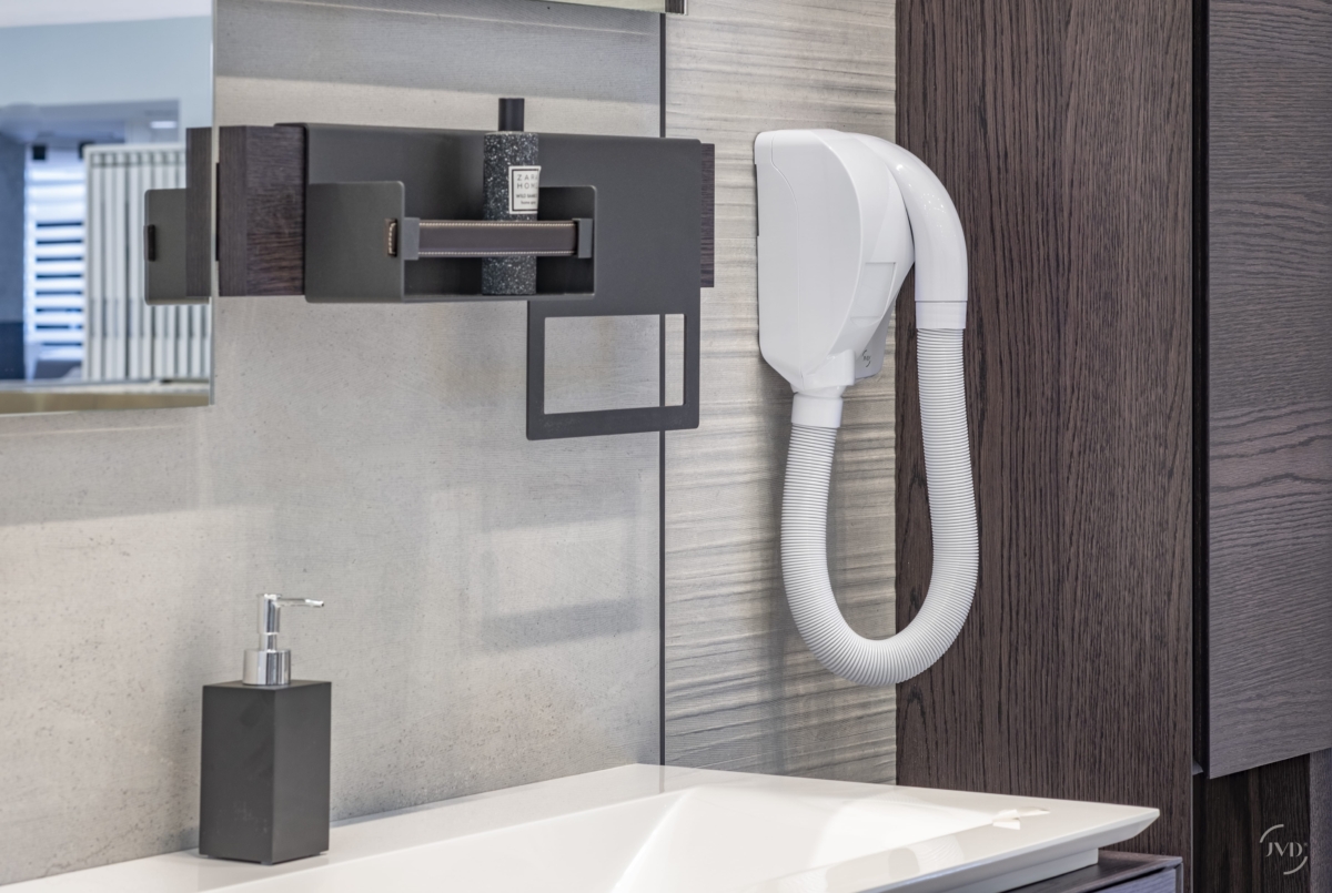 Secador de pelo Caraïbe base con temporizador de seguridad de 15 min, potencia 1000 W, manguito patentado para facilitar el peinado. Instalación en volumen 2. Garantía de 3 años.