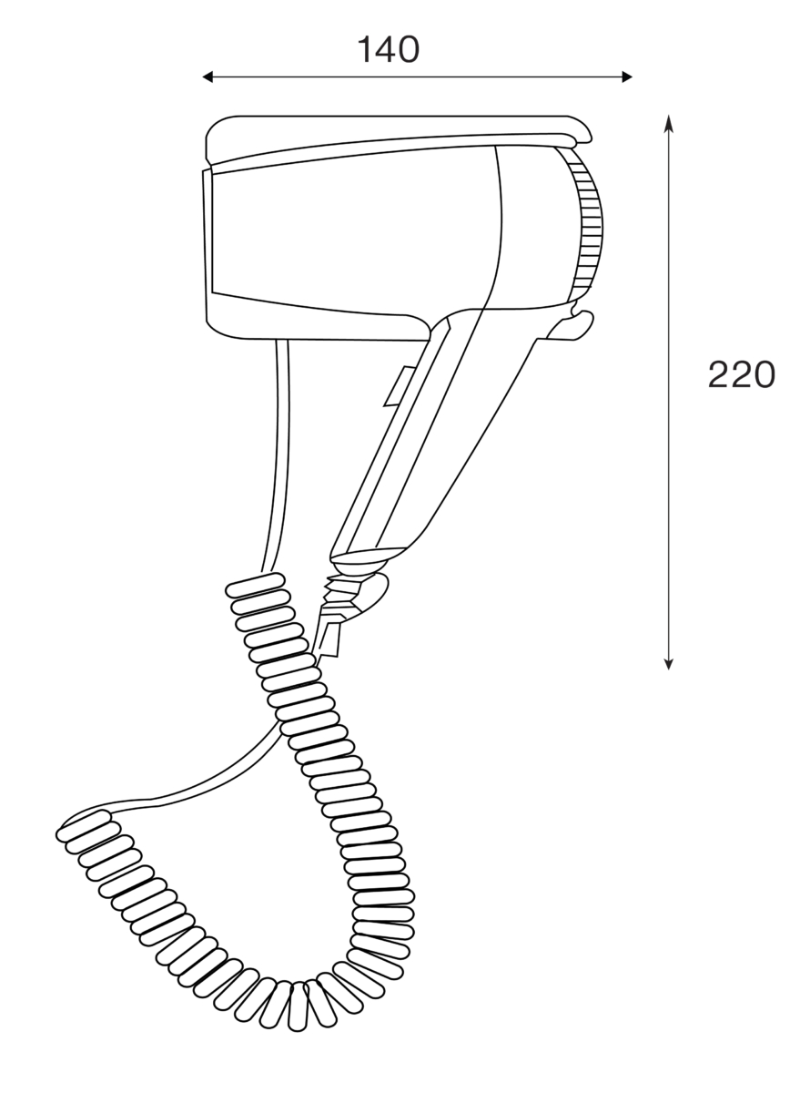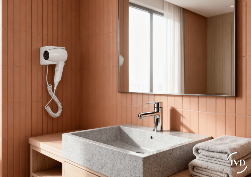 Secador de pared JVD Glow – Solución económica para habitaciones de hotel, con 1400W de potencia e ionizador integrado para un secado eficiente. Soporte mural práctico (apagado automático al colgar) y cable rizado para almacenamiento fácil y espacios ordenados. Ideal para hoteles que buscan equipamiento económico y funcional.