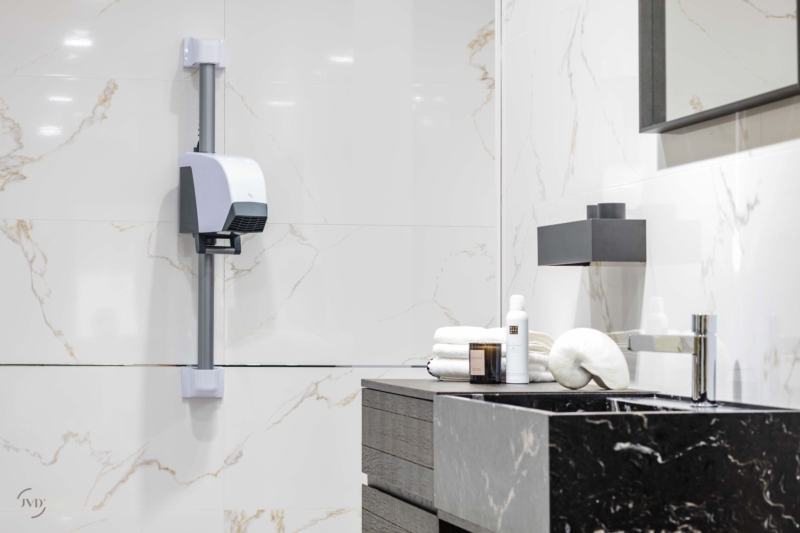 Secador de pelo Neptune blanco para piscinas y gimnasios, resistente en atmósfera clorada y provisto de un motor de inducción para un uso intensivo. Altura ajustable y ergonómico (rotación 180°). Garantía 3 años.
