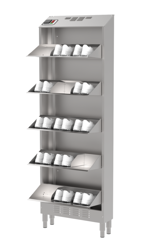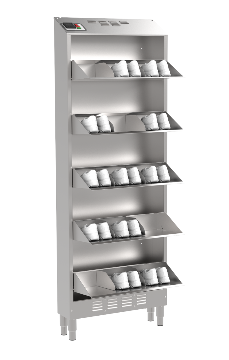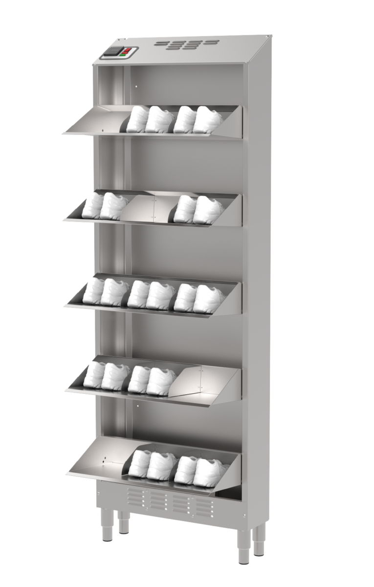 Compacto y fabricado completamente en acero inoxidable, HYGIcase cuida hasta 15 pares de zapatos bajos mediante un secado rápido, desinfección eficaz y desodorización sin productos químicos. Su tecnología elimina los microorganismos tanto en el interior como en el exterior del calzado. Gracias a su diseño ultraoptimizado, ocupa un espacio mínimo: solo 20 cm de profundidad.