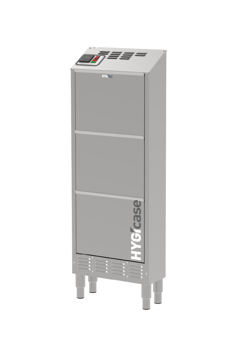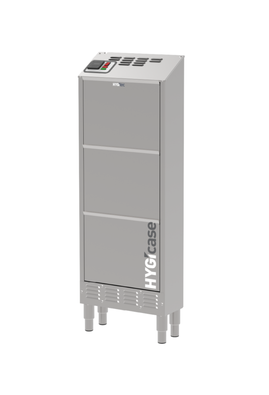Compacto y fabricado completamente en acero inoxidable, HYGIcase cuida hasta 6 pares de zapatos bajos mediante un secado rápido, desinfección eficaz y desodorización sin productos químicos. Su tecnología elimina los microorganismos tanto en el interior como en el exterior del calzado. Gracias a su diseño ultraoptimizado, ocupa un espacio mínimo: solo 20 cm de profundidad.