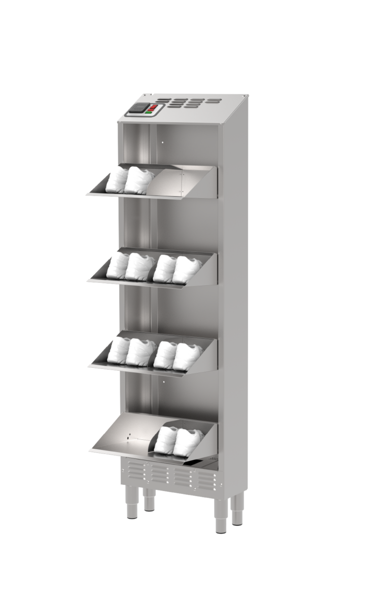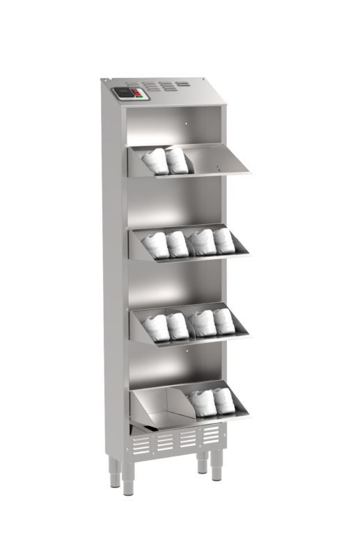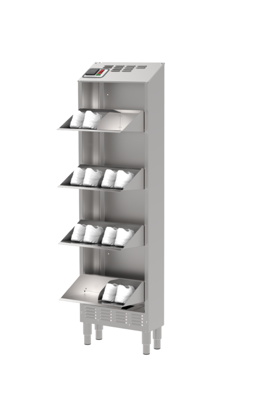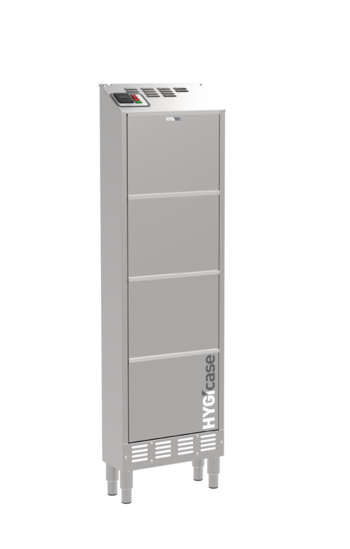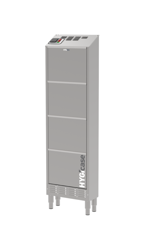 Compacto y fabricado completamente en acero inoxidable, HYGIcase cuida hasta 8 pares de zapatos bajos mediante un secado rápido, desinfección eficaz y desodorización sin productos químicos. Su tecnología elimina los microorganismos tanto en el interior como en el exterior del calzado. Gracias a su diseño ultraoptimizado, ocupa un espacio mínimo: solo 20 cm de profundidad.