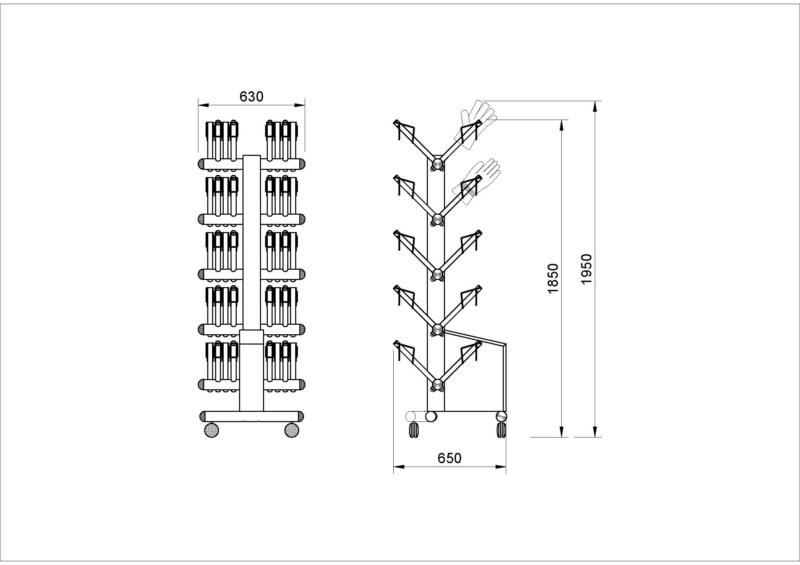Secador de guantes HYGIgrip para 20 pares, de doble cara, en acero inoxidable 304L. Sanea sin químicos todo tipo de guantes. Equipado con manguitos específicos y 4 ruedas giratorias. Compacto, robusto y eficaz.