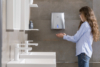Secador de manos Copt'Air gris metalizado con bajo consumo de energía y antivandalismo (carcasa de aluminio). Secado ultrarrápido con su boquilla giratoria. Adaptado a una fuerte asistencia.
