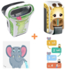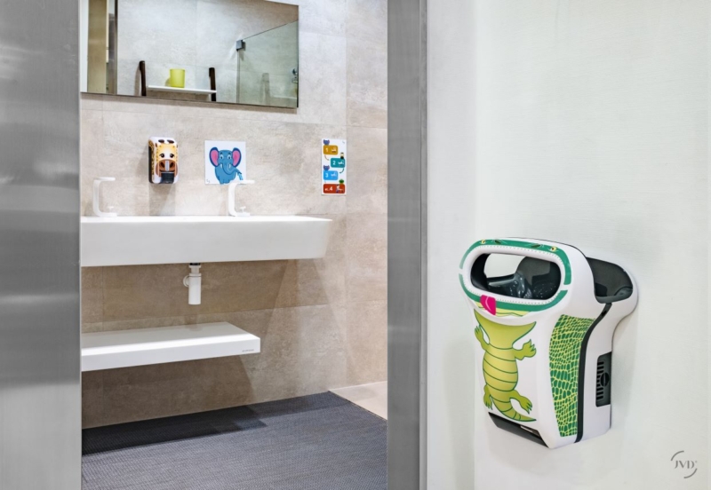 Pack que incluye un secamanos Exp'Air KIDS blanco, un dispensador de jabón Cleanline Kids Gel y placas pedagógicas para acompañar a los niños durante el lavado de manos.