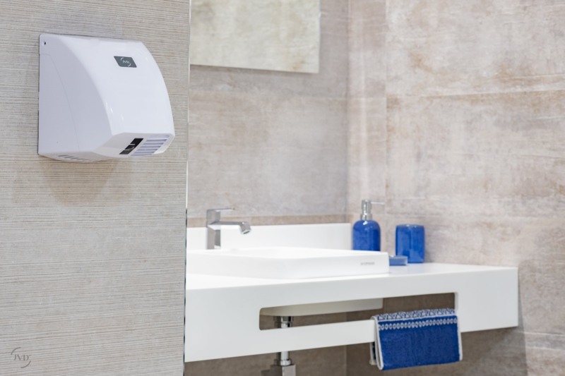 Secamanos Zephyr blanco fabricado con materiales de origen biológico, automático de aire caliente, antivandálico (IK10) y con logotipo personalizable. Garantía de 3 años.