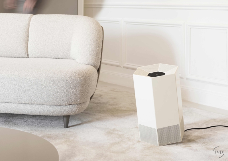 Purificador de aire profesional Shield Blanco Crema, fabricado en Francia, conforme a la norma NF B44-200, cubriendo una superficie de hasta 60 m².