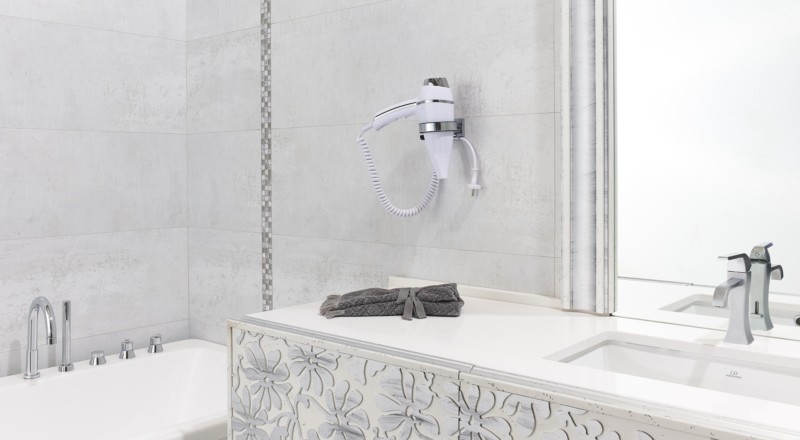 Soporte antirrobo mural Alteo que permite bloquear el cable eléctrico del secador de pelo Alteo.