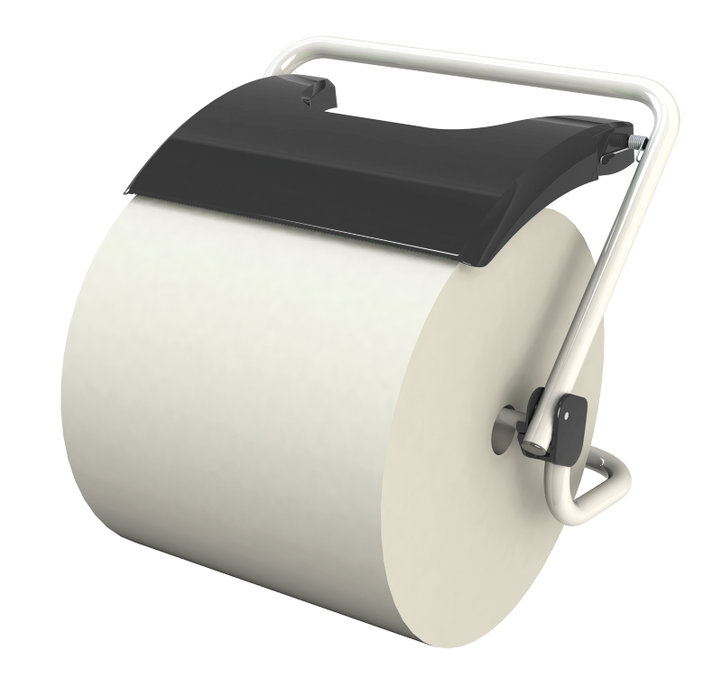 Soporte mural para bobina industrial con una sierra de plástico integrada en la tapa.
