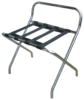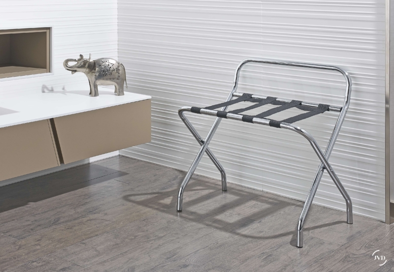 Soporte para maletas con respaldo metálico cromado y tubos de acero. El soporte está equipado con 4 cintas de alta resistencia y 2 cintas de sujeción. Su capacidad de carga es de 220 kg.