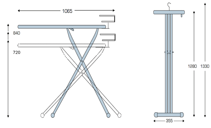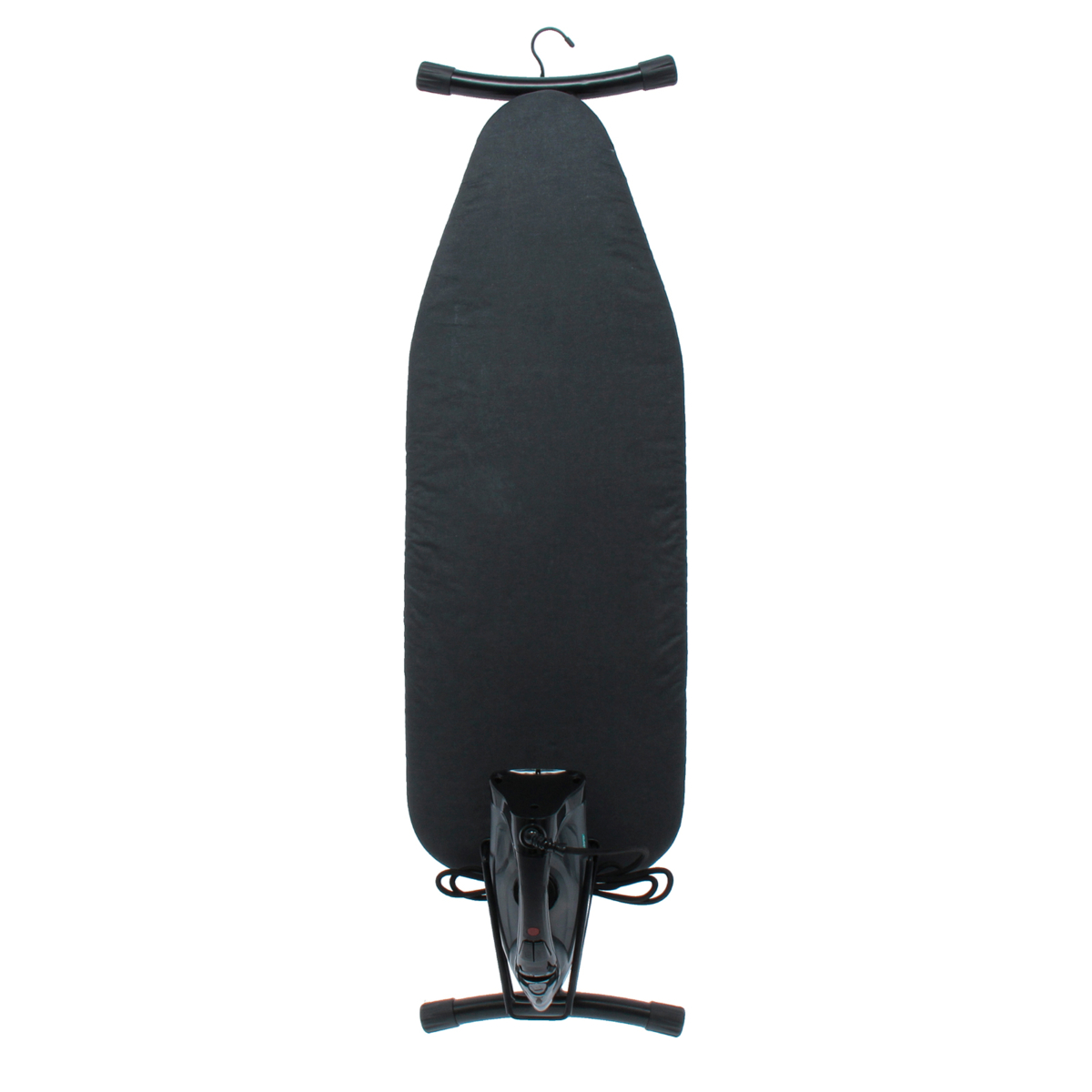 Tabla de planchar Swivel para hoteles: amplia superficie 968x330 mm, funda negra ignífuga de 10 mm, soporte para plancha pivotante integrado, gancho de suspensión, acabado negro elegante. Altura regulable de 72 a 84 cm.